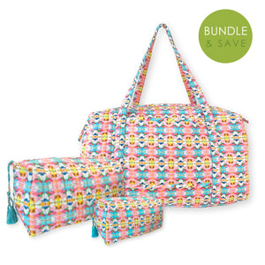 Includes 1 small cosmetic bag, 1 large cosmetic bag, and 1 weekender duffle.